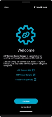 nRF Connect Device Manager is a generic tool for updating and managing devices running nRF Connect SDK supporting Device Manager module over Bluetooth LE (aka Management Subsystem, Mcu Manager, SMP Server).