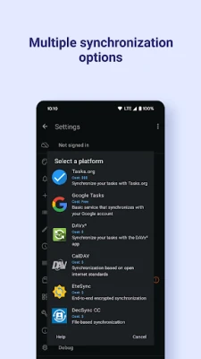 • Synchronize with Google Tasks, DAVx⁵, CalDAV, EteSync, DecSync CC, or use completely offline